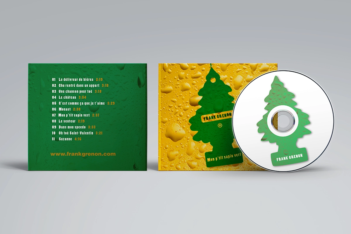 Nous avons eu le plaisir de mettre notre créativité au service de Frank Grenon, auteur-compositeur-interprète, dans le design d’une pochette d’album (Mon p’tit sapin vert) fidèle à son style musical, ainsi que dans la création d’un site web donnant accès à ses chansons. Envoyé à différentes maisons de disque, ce site web lui a valu un contrat de disque pour la réalisation de son deuxième album intitulé Mort-Riville.